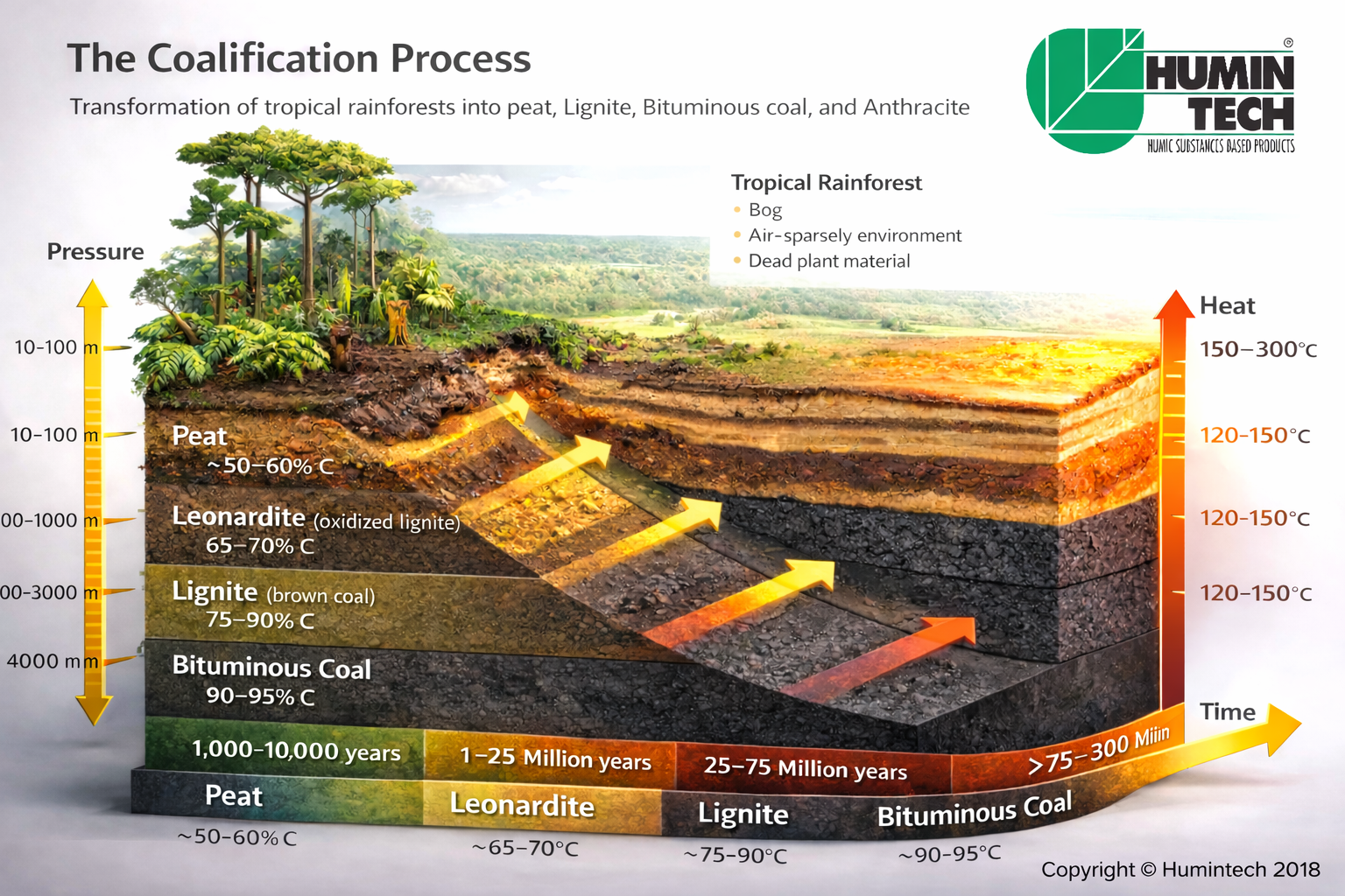 Shows the formation of coal (lignite) to Leonardite and its basic extraction to obtain
