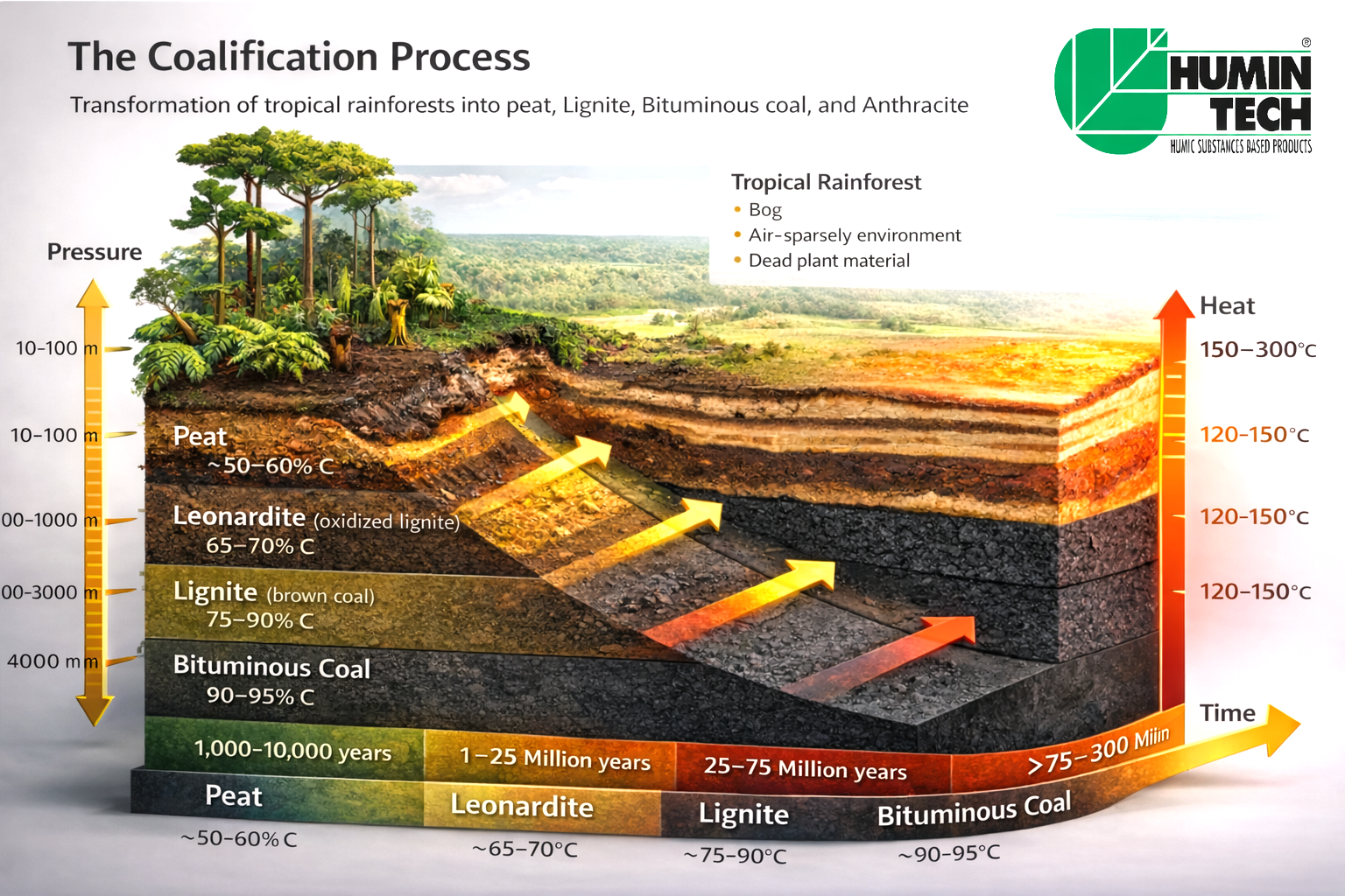 Shows the formation of coal (lignite) to Leonardite and its basic extraction to obtain